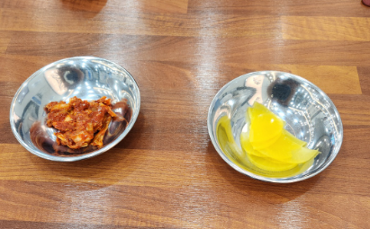 자리에 앉으시면 곧 기본 반찬이 나옵니다. 여기는 밑반찬이 많이 나오지 않습니다. 딱 두 가지인데 매운 김치와 무침 단무지, 절인 단무지입니다. 추가 반찬은 셀프입니다.