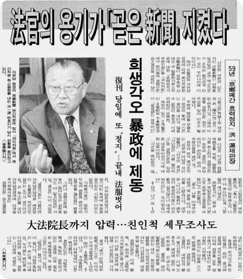 그러나 서울고등법원 특별1부는 정권의 압력 속에서도 폐간처분의 효력을 정지시키는 결정을 내렸다. 재판장 홍일원 판사는 이후 “정부 패소가 나오면 다 죽는다”는 위협을 매일 들었지만, 이를 뚫고 소신 판결을 내렸다고 회고했다. 이는 사법부 독립이 선언적 문구가 아니라 누군가의 실제 용기 위에서 작동한다는 사실을 보여주는 상징적인 장면이다.